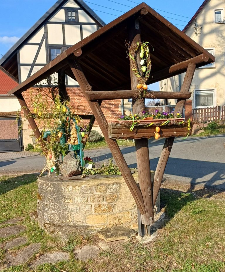 Zentral steht ein immer schön geschmückter, alter Dorfbrunnen.