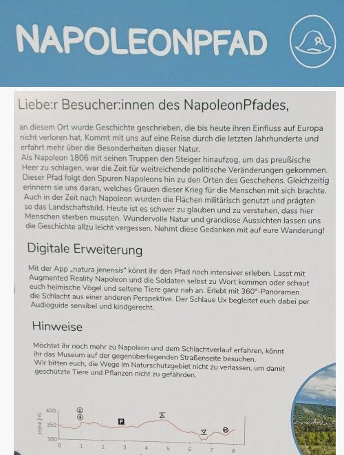 Hinweis: Der NapoleonPfad führt zum Großteil über offenes Gelände. Achtet deshalb unbedingt auf die Witterung und denkt zum Beispiel bei hohen Temperaturen und starker Sonneneinstrahlung an einen guten Sonnenschutz und ausreichend Getränke (von https://www.natura-jenensis.de/aktiv/details/napoleonpfad).